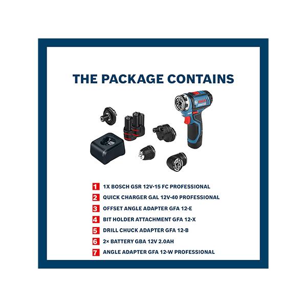 Scope of supply: Drill chuck adapter GFA 12-B, Off-set angle adapter GFA 12-E, Angle adapter GFA 12-W, Hex adapter, 1 Charger, 2 x 2.0 Ah LI-ion batteries, Carry case
